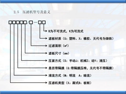 2.5 麻豆操逼视频大全型號及意義 / — B為不可洗式,K為可洗式 濾板材質(U:塑料、X:橡膠、無代號為鑄鐵) 過濾麵積(m²) 濾板尺寸(mm) 壓緊方式(S:手動J:機械Z:動Y:液壓) 是否帶隔膜(G:帶隔膜壓榨,無代號不帶隔膜) 液流方式(M:明流 A:暗流) 麻豆操逼视频大全類型(X:廂式B:板框)